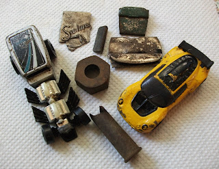 Got permission to hunt 2 more closed schools, both dating back to the late 1800's and showing lots of promise. First one produced 11 coins of which 6 were pre decimals, all pennys and a couple of them early 1900's British. May be worth another look but the trash to coin ratio was huge. The second school produced 13 coins, 12 of them decimal....... supprisingly the 13th was a British 1916 shilling. I have a feeling this school may not quite be on its original site. So thats the bad news...........Good news is today we headed back to a park in a town nearby we hunted recently. Total haul 29 coins, including 8 toasted pennys, a 1/2 penny, $4.50 in spending and the usual old decimals. Nice to find an almost intact Fun Ho D8 bulldozer, a Fun Ho holden chassis and the little stg silver bracelet was a bonus. I think the round lead thing with 2 holes is an old hem weight?